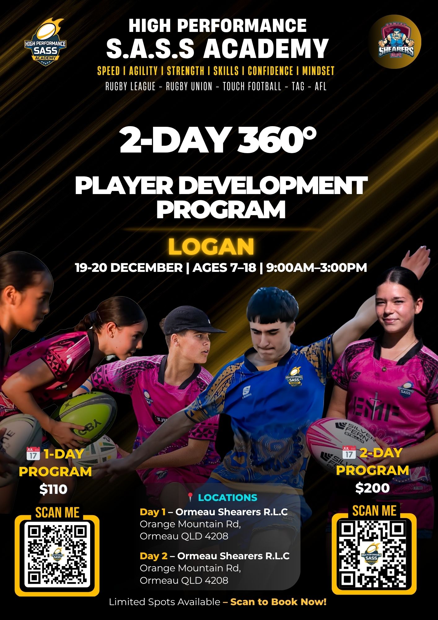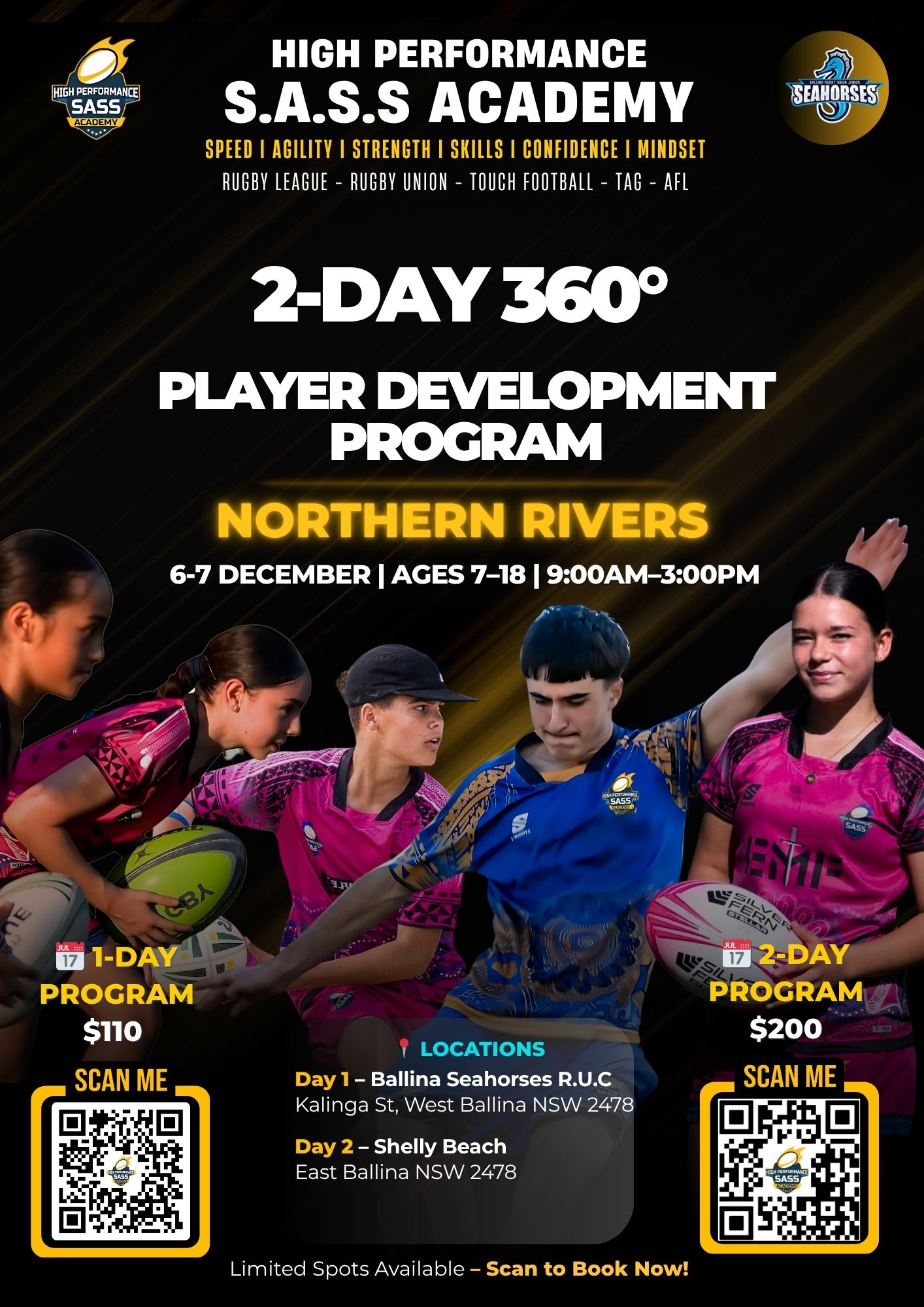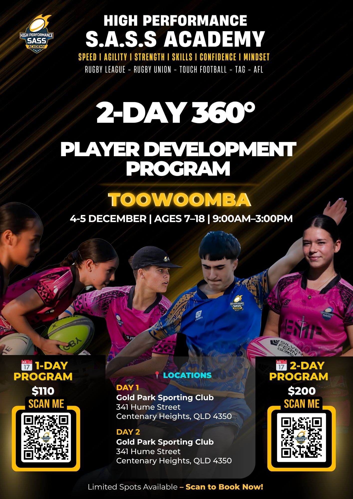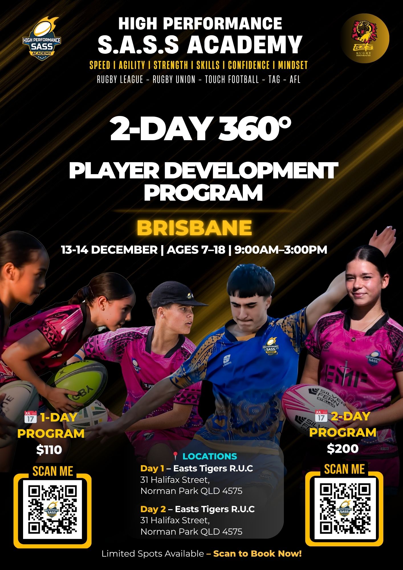 Maximise your physical and mental potential by joining us for the renowned 1-Day 360 Degree Player Development Program! This program is specifically tailored to elevate sporting performance by enhancing speed, agility, strength and skill levels of female and male athletes aged 8 - 18 years in rugby league, rugby union, touch football and Oztag.